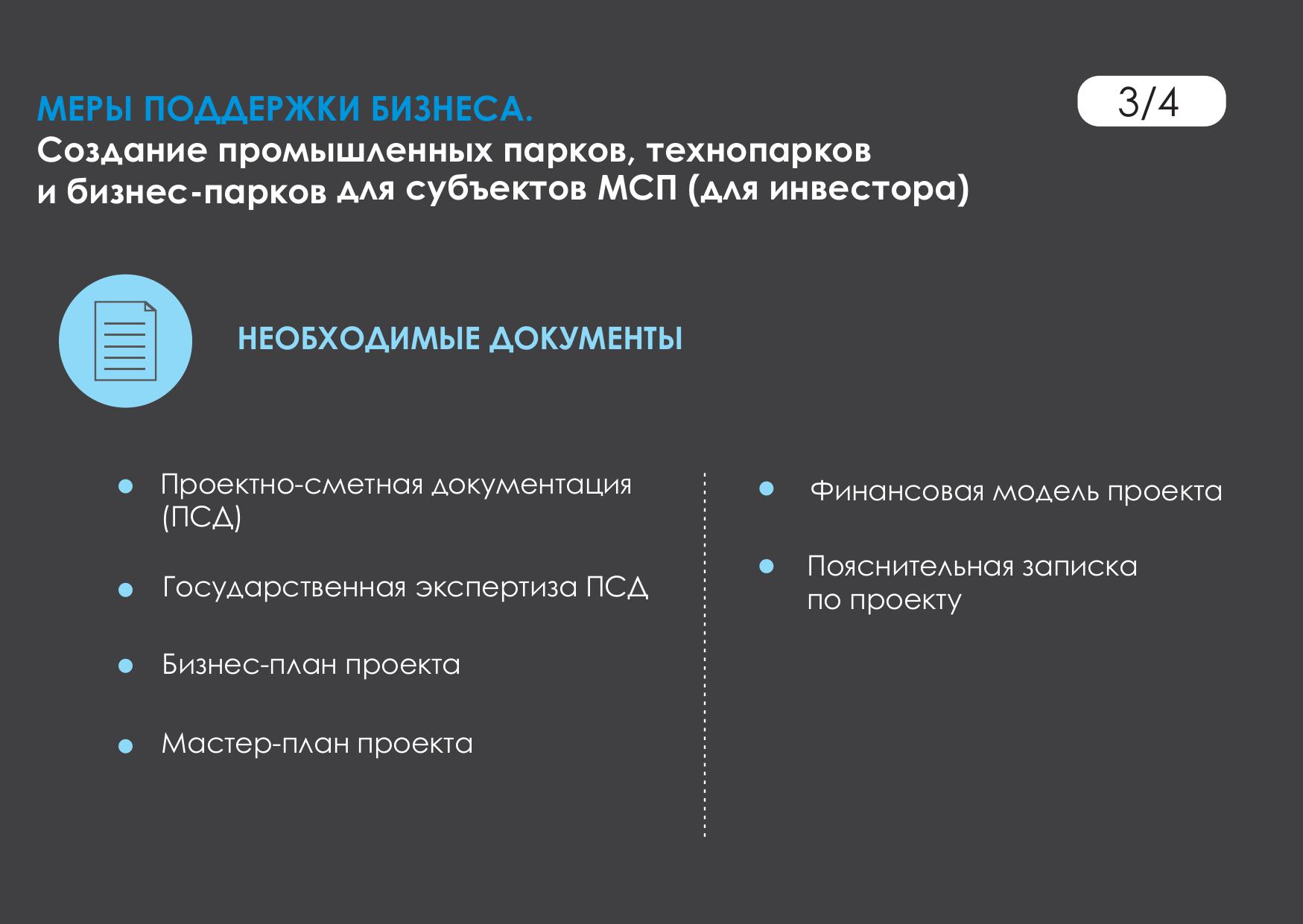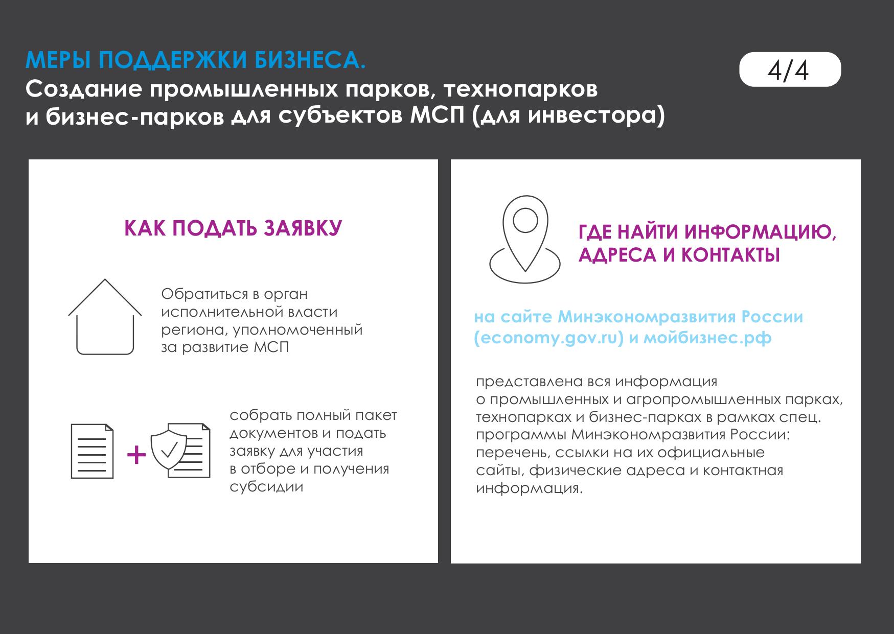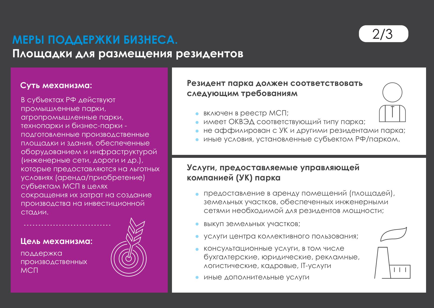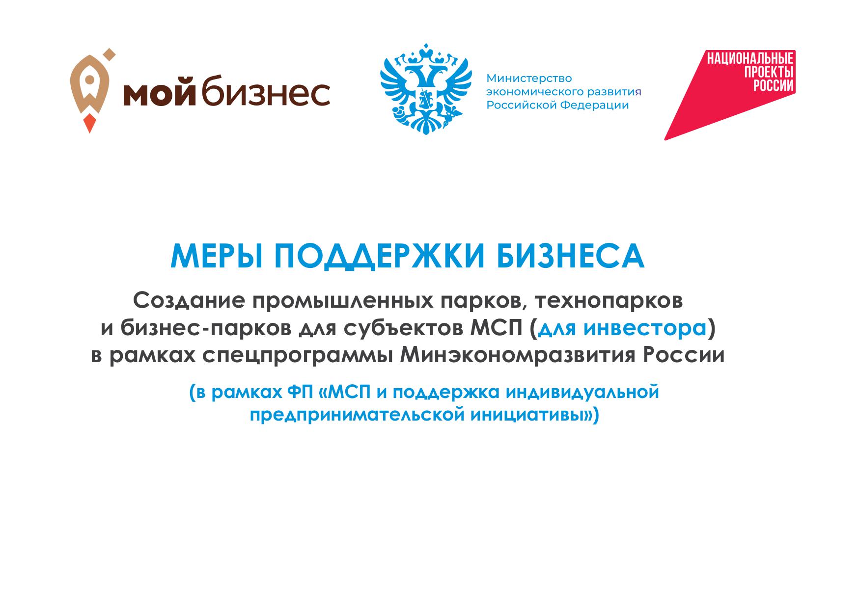 • Создание промышленных парков, технопарков и бизнес-парков для размещения резидентов в рамках спецпрограммы Минэкономразвития России