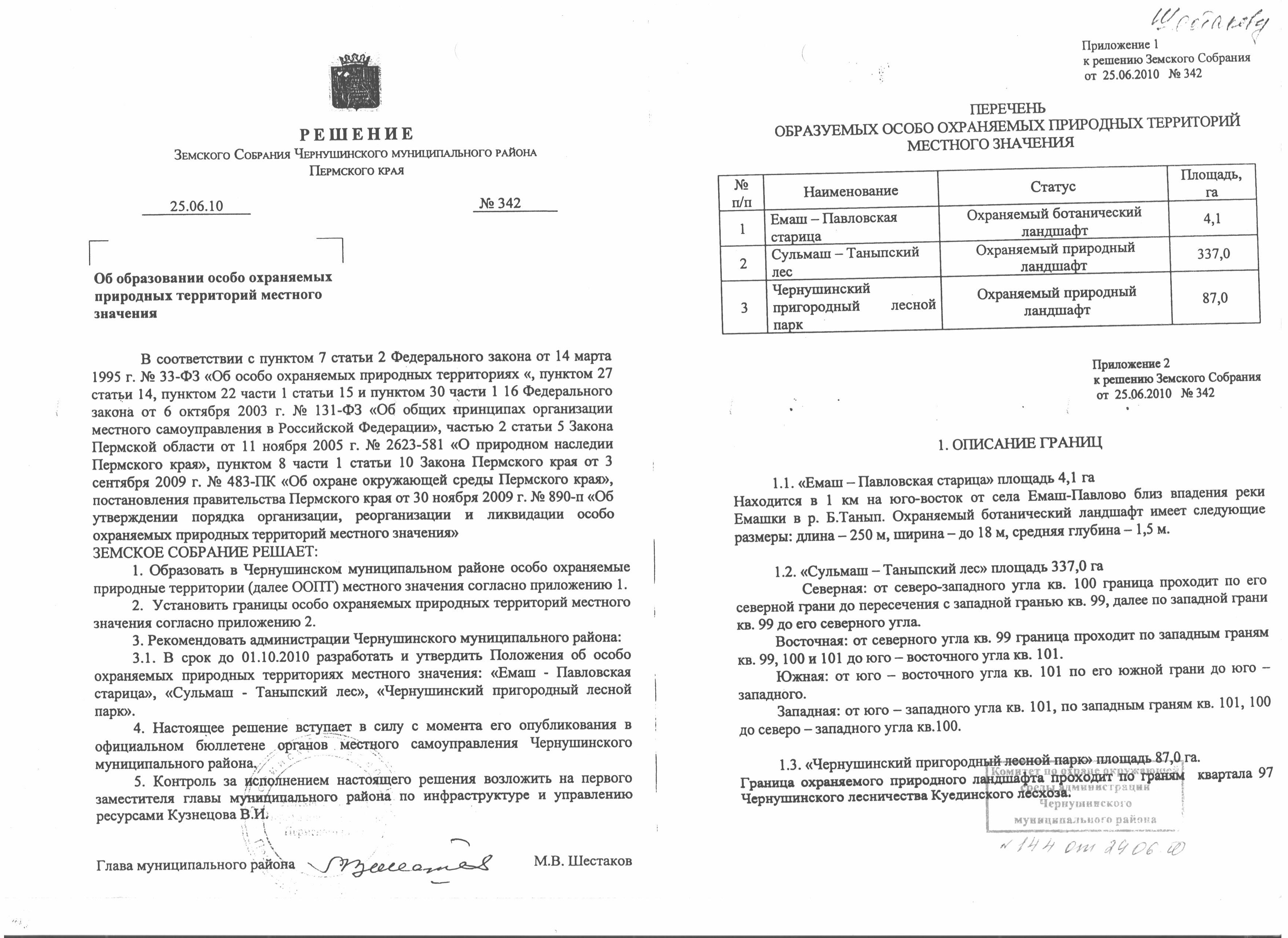 ♦ Решение Земского Собрания Чернушинского муниципального района Пермского края от 14.12.2018 № 412 "О внесении изменений в приложения 1, 2 к решению Земского Собрания от 25.06.10 № 342 "Об образовании особо охраняемых природных территорий местного значения"