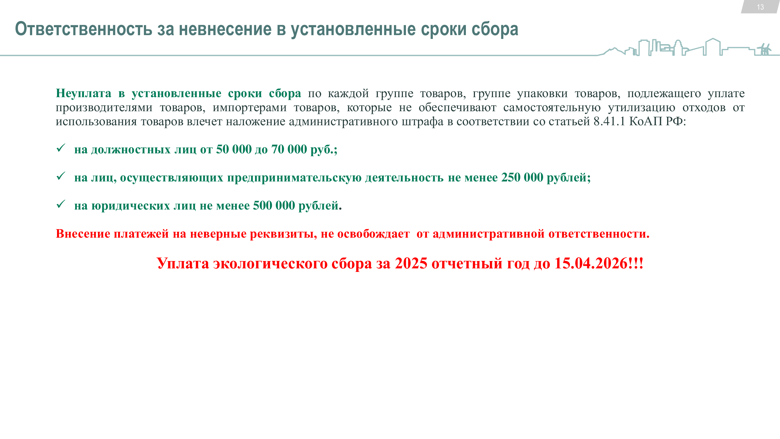 - невнесение в установленные сроки экологического сбора влечет за собой административную ответственность, предусмотренную статьей 8.41.1 КоАП Российской Федерации (на юридических лиц - в трехкратном размере неуплаченной суммы сбора по каждой группе товаров, группе упаковки товаров, подлежащего уплате производителями товаров, импортерами товаров, которые не обеспечивают самостоятельную утилизацию отходов от использования товаров, но не менее пятисот тысяч рублей).