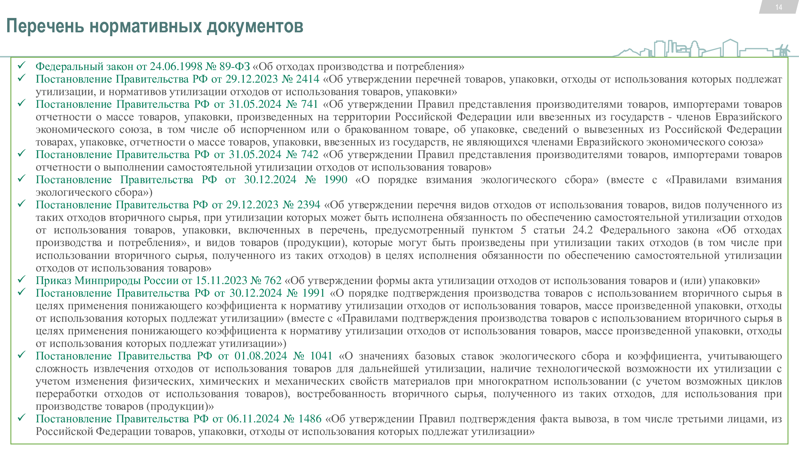 Перечень товаров, упаковки, отходы от использования которых подлежат утилизации, а также перечень нормативов утилизации отходов от использования товаров, упаковки утвержден постановлением Правительства Российской Федерации от 29.12.2023 № 2414.