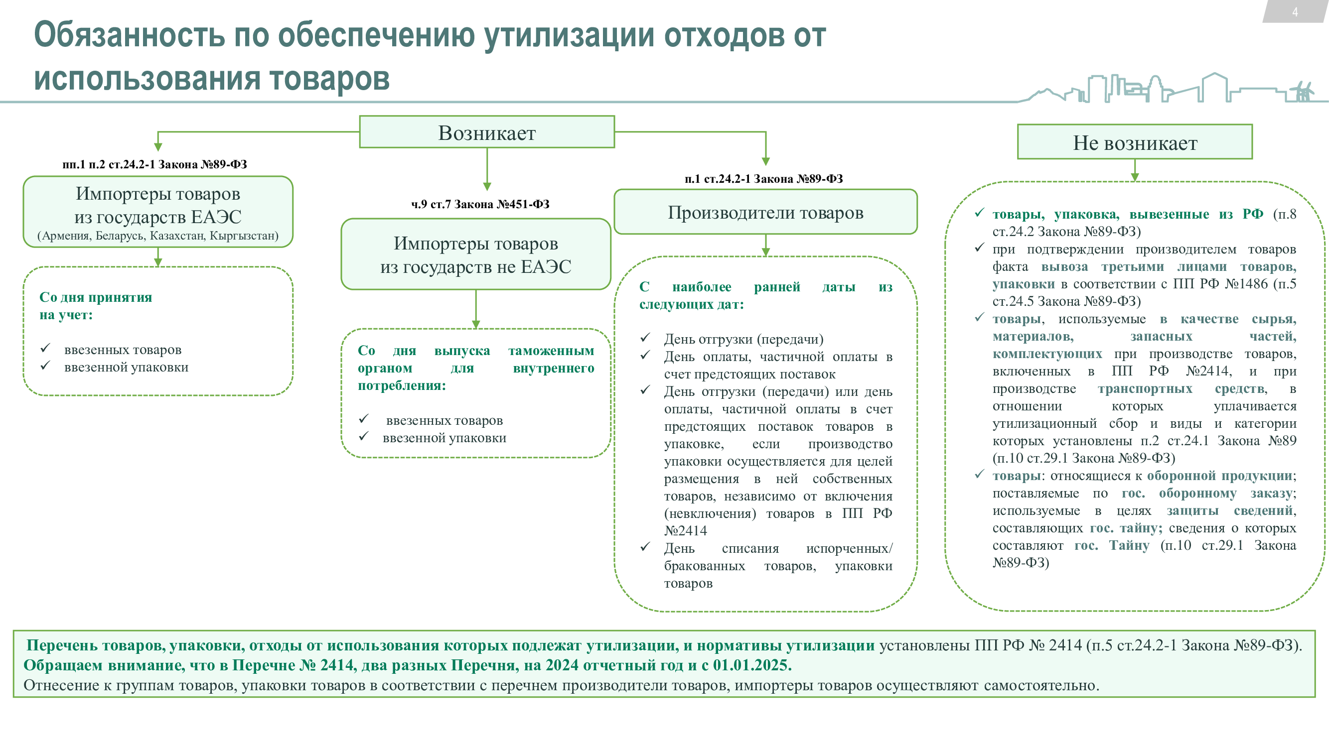 В соответствии с п. 1 ст. 24.2 Закона № 89-ФЗ юридические лица и индивидуальные предприниматели, осуществляющие производство товаров, упаковки на территории Российской Федерации (далее - производители товаров), юридические лица и индивидуальные предприниматели, осуществляющие ввоз товаров, в том числе товаров в упаковке, из государств, не являющихся членами Евразийского экономического союза, или ввоз товаров из государств - членов Евразийского экономического союза (далее - импортеры товаров), обязаны обеспечивать утилизацию отходов от использования товаров.