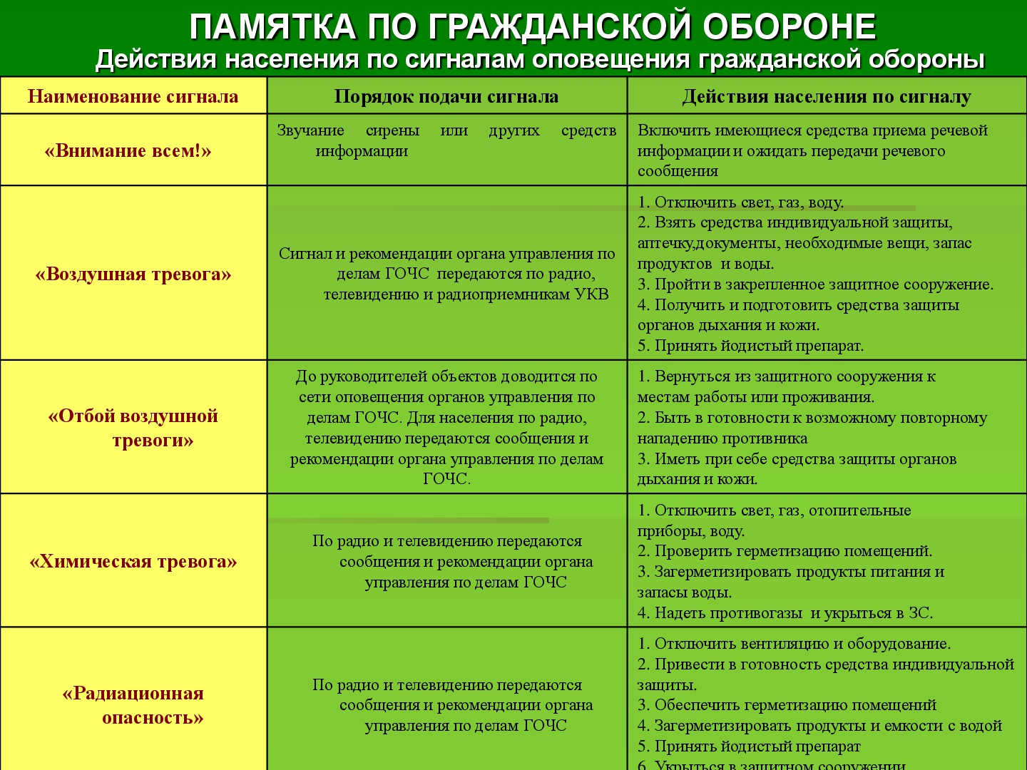 Существует пять сигналов гражданской обороны: «Внимание всем!», «Воздушная тревога», «Отбой воздушной тревоги», «Радиационная опасность», «Химическая тревога».